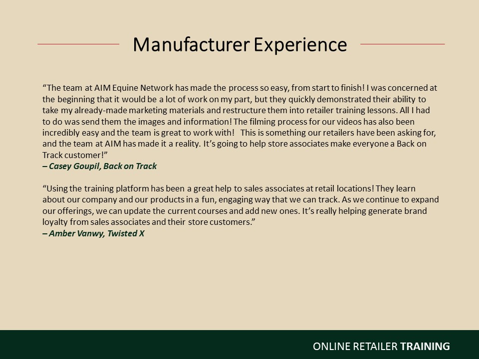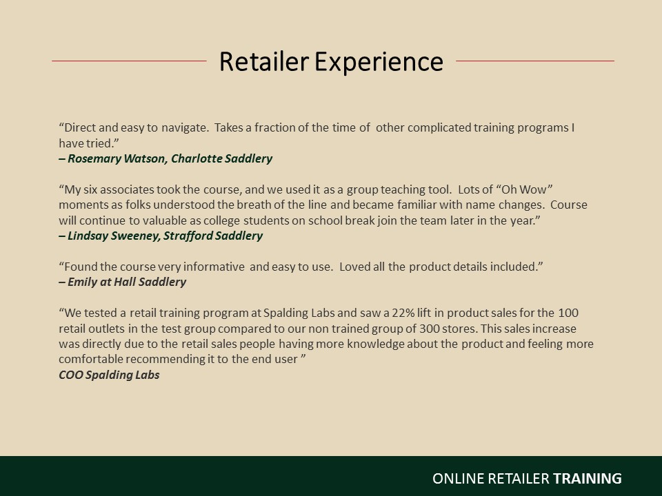 EN Online Retailer Training was launched in the fall of 2016 as a complete, customized learning module program created by horse people to help equine retailers become more knowledgeable on horse owner needs and the products that fill them. The program now serves over 1000 retailers with courses from a wide selection of national brands.